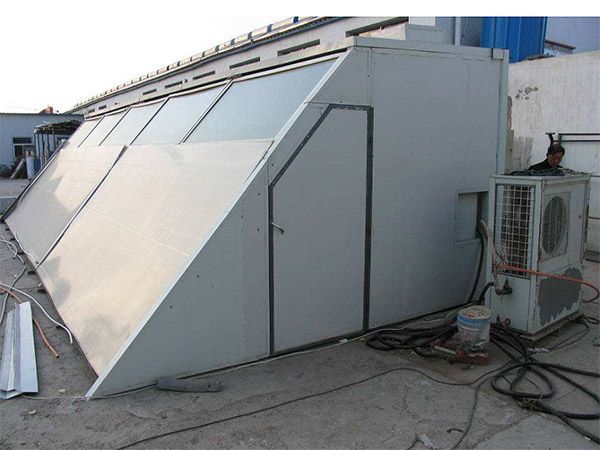 熱泵助推式太陽能烤房主要由太陽能空氣集熱器、空氣源高溫?zé)岜谩⒅悄芑痉肯到y(tǒng)三部分組成。通過太陽能空氣集熱器對(duì)空氣進(jìn)行加熱,利用循環(huán)風(fēng)機(jī)通過管道將高溫空氣傳輸?shù)娇痉吭诳痉績?nèi)通過太陽能空氣集熱器對(duì) 空氣進(jìn)行加熱,利用循環(huán)風(fēng)機(jī)經(jīng)過管道將高溫空氣傳輸?shù)娇痉績?nèi);通過溫、濕度感應(yīng)器檢測,根據(jù)所測溫、濕度和干燥工藝,由智能化控制器控制空氣源熱泵的啟、停,排濕門的開、閉、實(shí)現(xiàn)全自動(dòng)干燥。